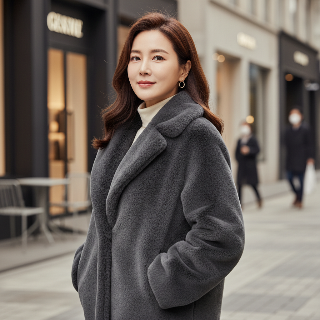 요즘 에코퍼는 질감이 정말 좋아서, 거리에서 보면 구분하기 어려운 제품도 많습니다. 특히 40~50대는 “과하게 화려한 리얼퍼 느낌”보다, 오히려 깔끔한 에코퍼가 더 세련돼 보이는 경우도 많아요.