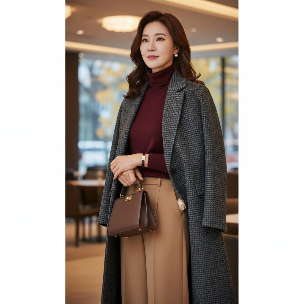 A. 미디 원피스(울/트위드) + 롱 코트 + 작은 주얼리 조합이 가장 안전합니다. 메이크업보다 옷의 소재가 먼저 보이게, 광택은 줄이고 질감은 살리는 방향을 추천드립니다.